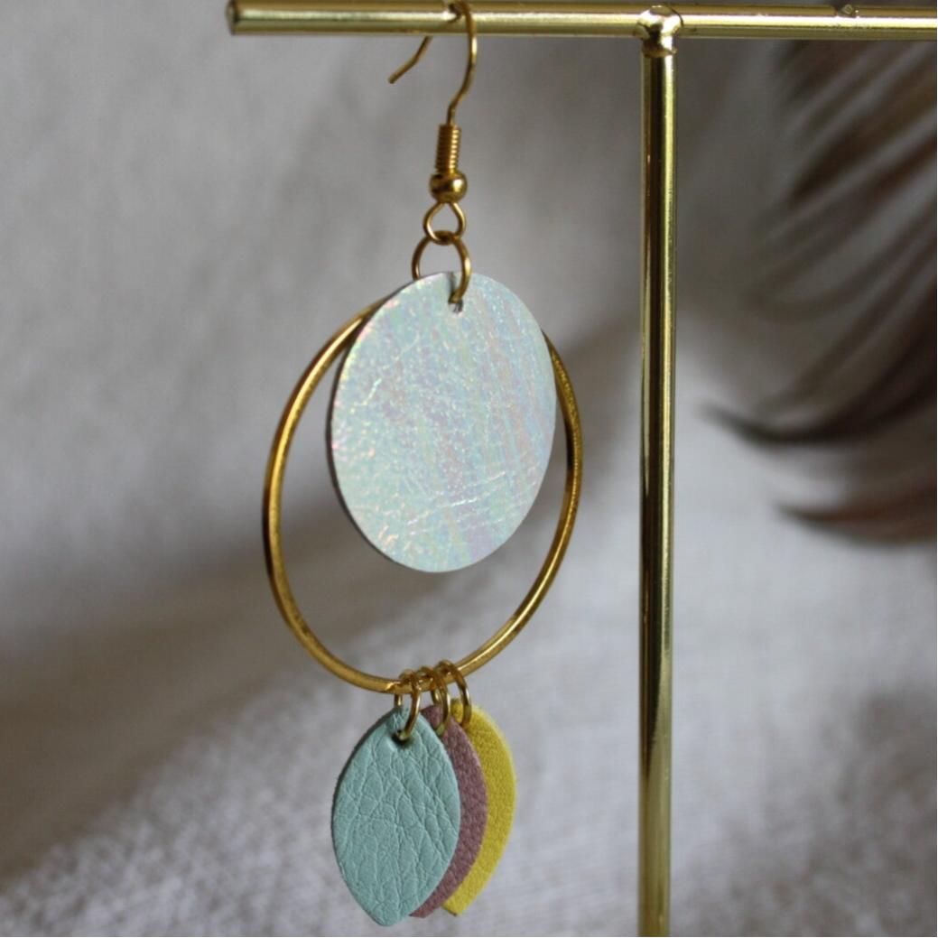 Boucles d’oreilles cuir blanc irisé & cercle doré jaune, bleu et rose clair