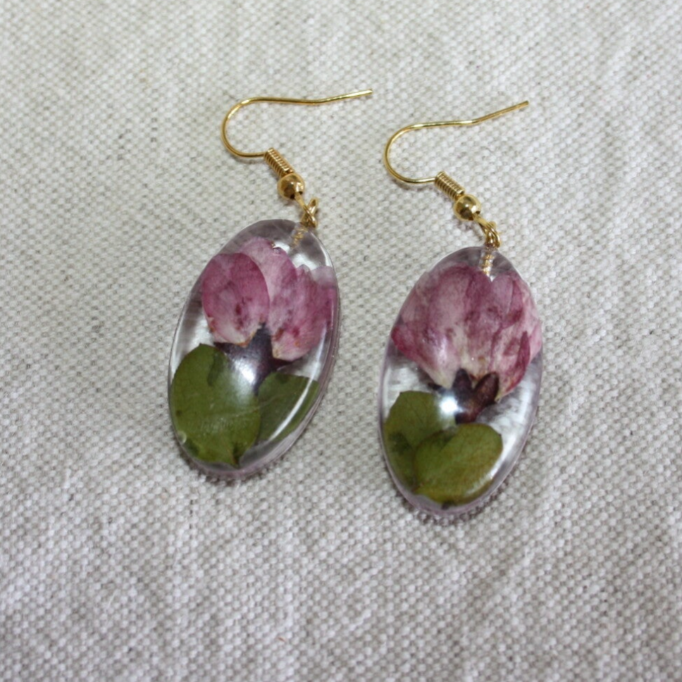 Boucles d’oreilles en résine – Fleur rose & feuillage naturel